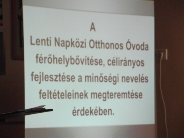 A nemzeti Fejlesztési Ügynökség által az Új Magyarország Fejlesztési Terv Nyugat –dunántúli Operatív Program keretén belül „Óvodák fejlesztése” címû felhívására Lenti Város Önkormányzata 2010. március 1. napján projekt javaslatot nyújtott be, melyet a Támogató Szervezet támogatásra érdemesnek ítélt.